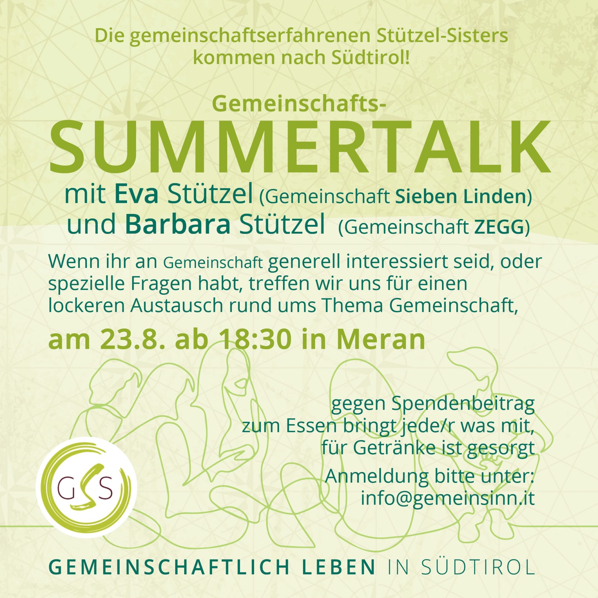 Die gemeinschaftserfahrenen Stützel-Sisters bei uns in Meran: Eva Stützel lebt in der Gemeinschaft Sieben Linden und Barbara Stützel in der Gemeinschaft ZEGG. In einem lockeren Austausch haben wir die Möglichkeit generell über gemeinschaftliche Wohnformen zu sprechen aber auch um spezielle Fragen zu stellen.